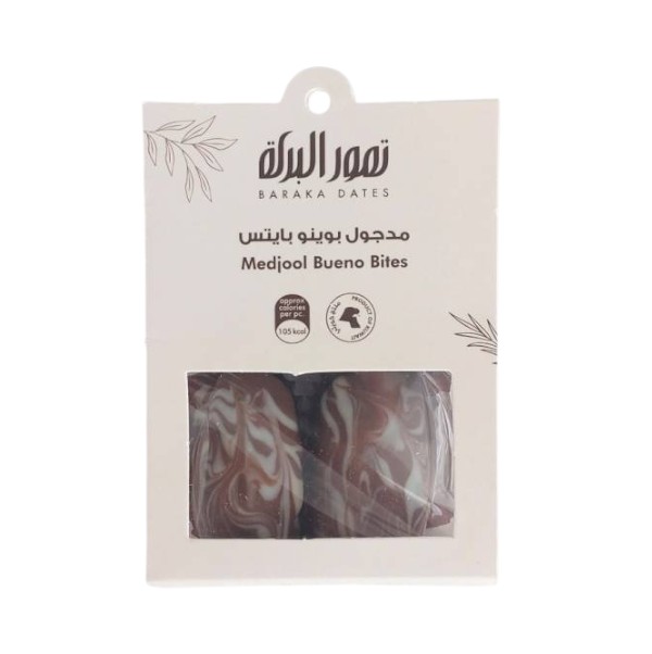 2 pieces of the irresistible Medjool bueno bites stuffed with the delicious popular hazelnut cream and dipped in Belgian milk chocolate.