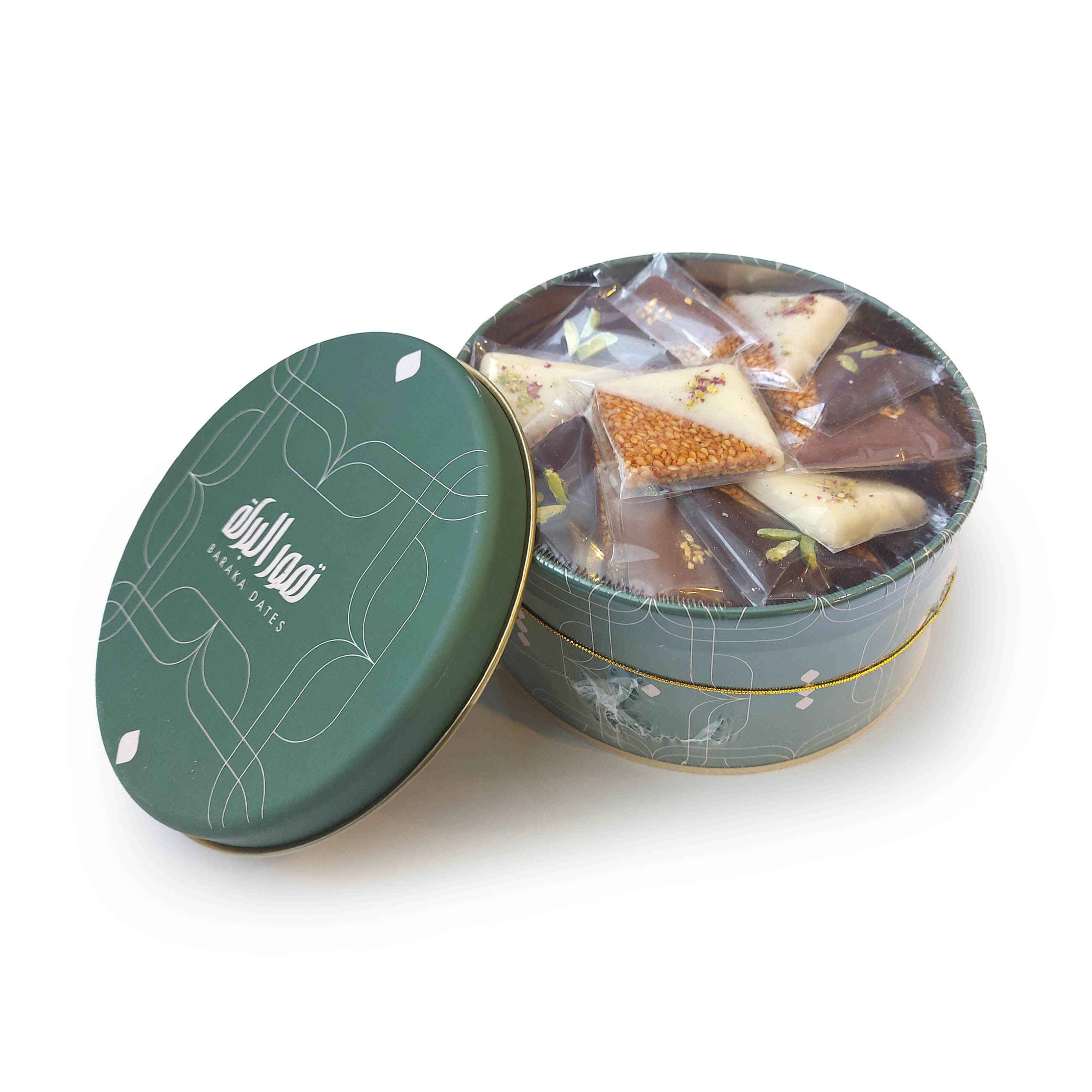 A simple fancy Medium sized Tinbox that contains 360gm of mix semsemiya with chocolate.