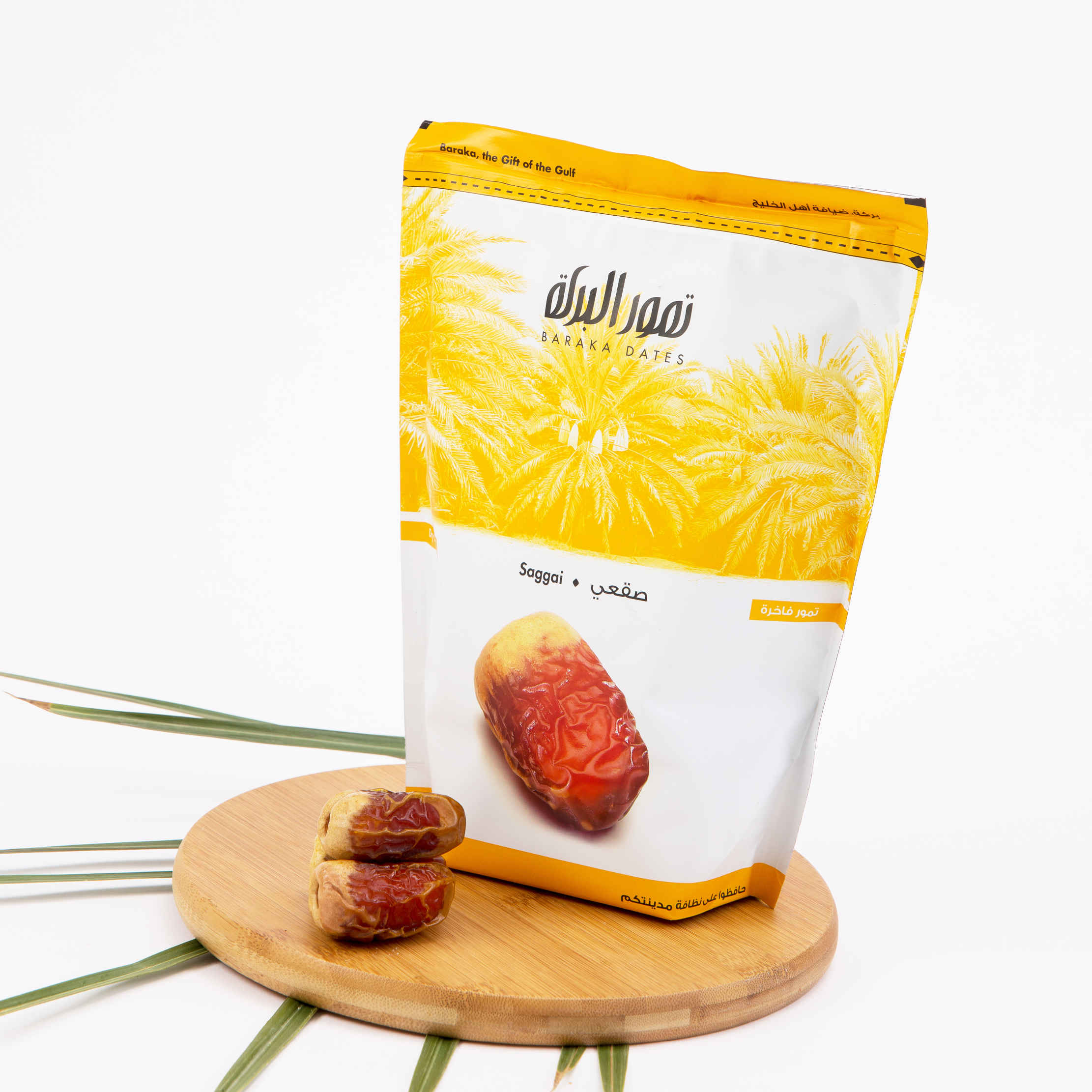 “Saggai dates” are characterized by their yellow color on the top and their dry texture, while the rest of the fruit is brown in color and has a soft texture, with a moderate sweetness. Packed in a re-sealable pouch
