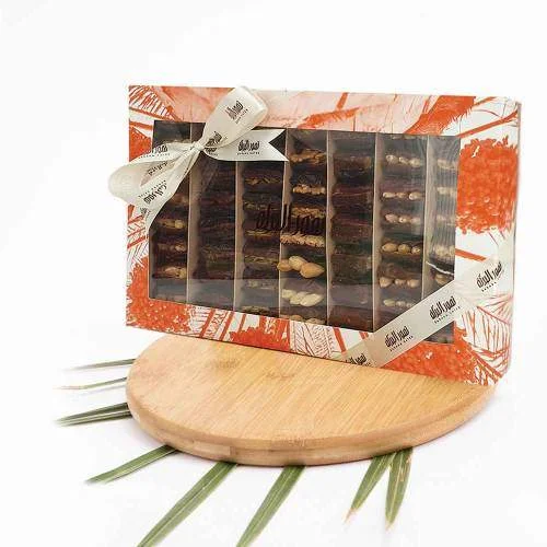 تمتع بتجربة متنوعة من النكهات الشهية مع علب الهدايا المحشية بالتمور حيث تحتوي على المكسرات المتنوعة الفاخره بالأضافه الى الحلويات اللذيذه اللتي تعطي طعم فريد للتمور. مما يجعلها هدية مثالية للمناسبات وللضيوف